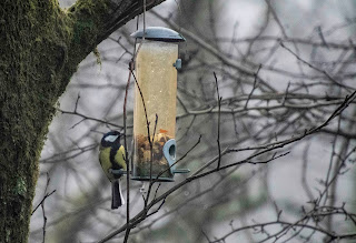 The woods were wonderfully atmospheric in the mist, The colours were beautifully muted. One thing I didn't expect was so much bird song, I thought I'd arrived too late to hear it at it's best, but as I walked further along the path I could see that Welcome To Our Woods had put up some new bird feeders, and they were doing a brilliant job of attracting the birds.